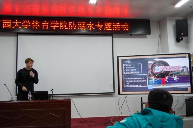 活动第一项是beat365官网登录中文运动训练183班孙宇同学(现广西游泳队现役运动员)首先向大家宣传了防溺水的重要性和必要性,并提大家要做到“六不六心”。在讲述的过程中,孙宇同学叮嘱大家强化安全意识,努力提升安全技能,强化风险意识教育,不能存在侥幸心理,正确评估自身水性实力,珍惜生命。