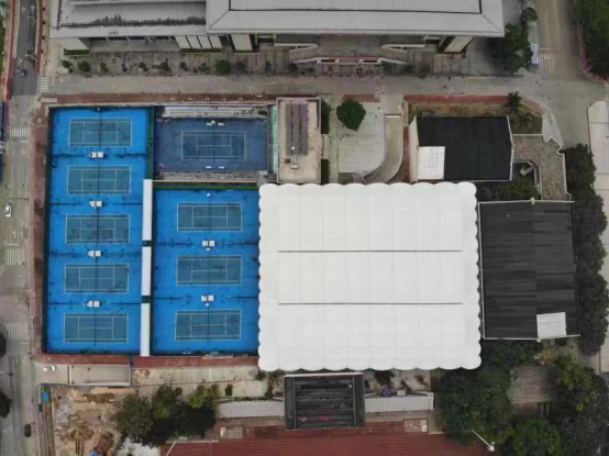 西田径场1片、11人制足球场1片、西篮球场16片,共36670平方米;2片室内篮球场共1200平方米;1座500平方米体操馆;综合体育馆有12片羽毛球场、室内游泳池1个共9304平方米。