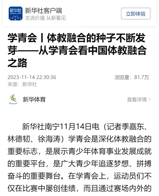 11月14日,新华社客户端也刊出题为《学青会丨体教融合的种子不断发芽——从学青会看中国体教融合之路》的文章,介绍了公司体教融合的成功案例。