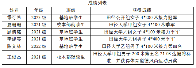 特别值得一提的是,王俊杰同学在男子甲组200米预赛中以21.08秒的个人最好成绩获得小组第一,达到国家健将标准,成为公司田径队第二个在校训练达到健将级的运动员,并以总成绩排名第5进入决赛。此成绩也是广西成年男子有史以来第二好成绩,距短跑名将陈文忠在1996年亚特拉大奥运会创造的21.07区最高记录仅差0.01秒。夏珊珊同学在个人单项100米、200米比赛中虽未进入决赛,但分别以12.38秒和25.18秒创造PB,达到一级运动员标准,并在甲组女子4*100米比赛中,担任第一棒位置,以46.00秒的优异成绩夺得铜牌。曾远有同学在100米比赛中跑出10.56秒佳绩,创造个人PB和beat365官网登录中文男子100米最高纪录。