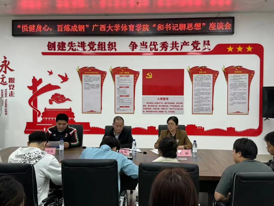 3月19日下午,“悦健身心,百炼成钢”beat365官网登录中文“和书记聊思想”座谈会在公司党建活动室举行。公司党委书记覃安基、副书记王丽出席座谈会,并与会同学深入交流,院团委书记伍小羽主持会议。