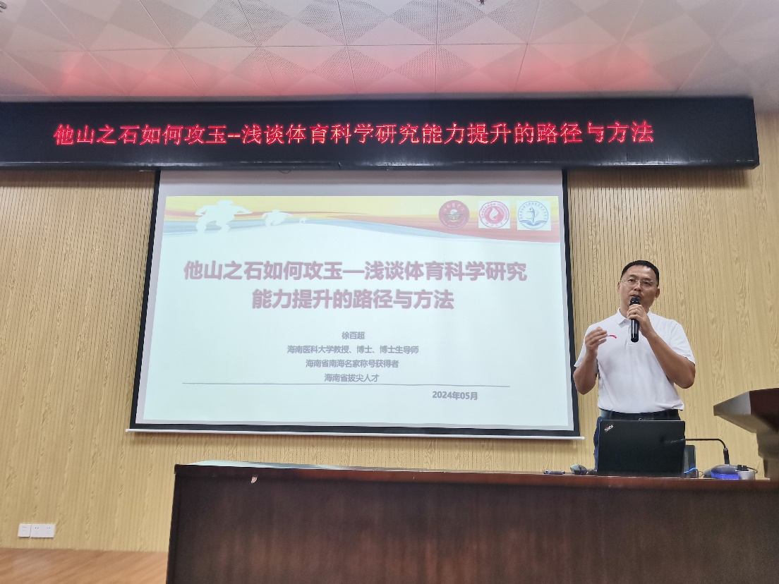 5月31日晚,海南医科大学徐百超教授给师生们做了题为:他山之石如何攻玉--浅谈体育科学研究能力提升的路径与方法”的专题学术讲座,讲座由刘晓红副经理主持。