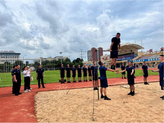 6月12日下午,beat365官网登录中文运动人体科学教研室主任郭旭霞副教授一行6人受邀深入广西消防救援总队训练与战勤保障支队开展调研,广西消防救援总队训练与战勤保障支队副支队长邓民、教学训练科科长潘江鸿、兰心均等热情接待了郭旭霞副教授一行,并陪同后者一同参观了“两库一中心”建设和实体化运行情况、新训大队的训练场地和设施设备情况,观摩了消防员的日常体能训练和实战技能训练。