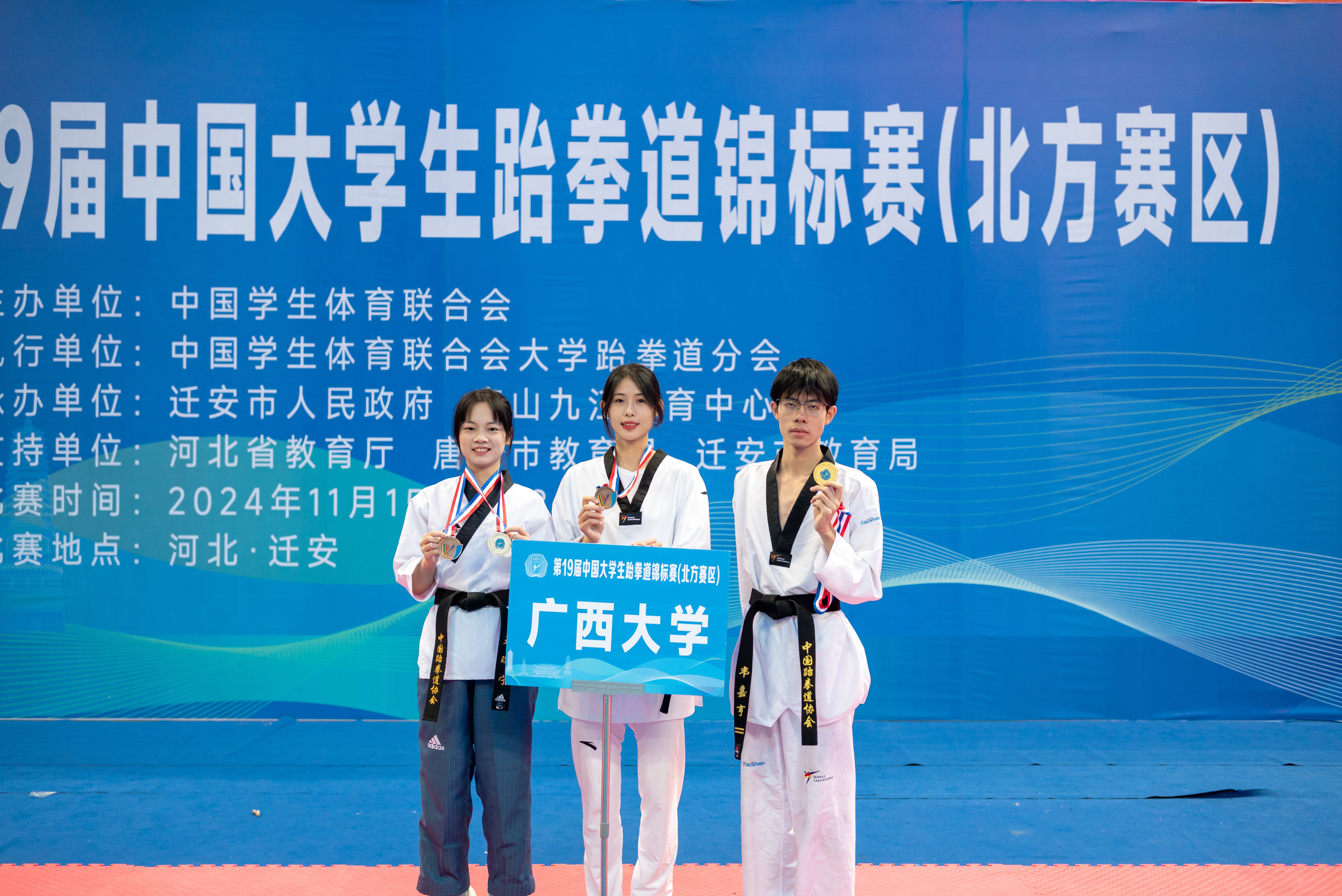 据悉,本次比赛共有来自全国128所高校、935名跆拳道运动员、教练员参赛,竞争激烈。来自资源环境与材料公司本科生韦嘉亨同学表现抢眼,以1天5场10局全胜的战绩夺得甲组男子个人竞技54kg项目冠军。beat365官网登录中文研究生王瑞宁获得甲组女子个人高阶品势第二名,甲组女子个人段位品势第三名。beat365官网登录中文本科生韩舒婷获得丁组女子个人竞技57kg第三名。