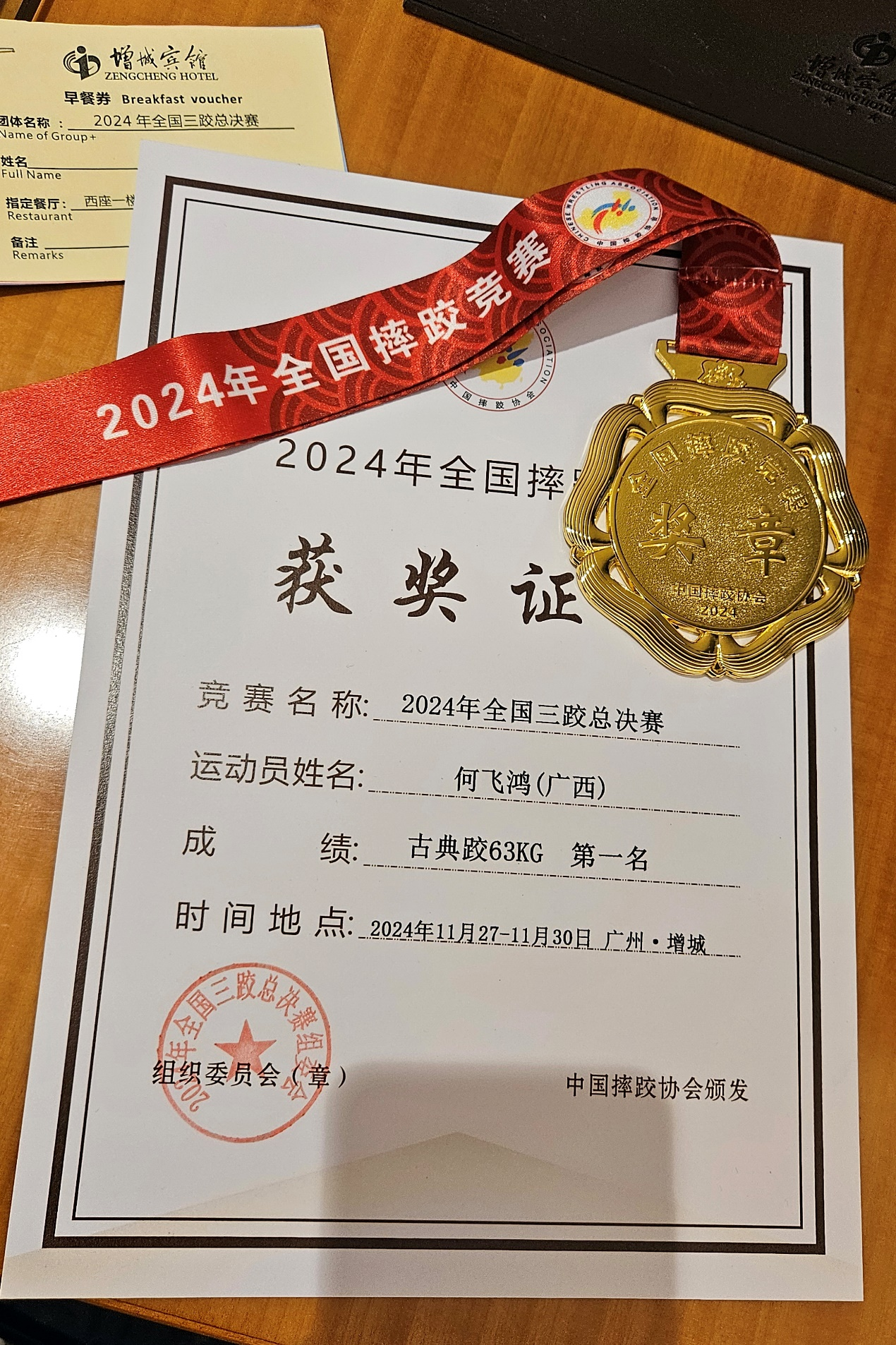 何飞鸿获奖证书及奖牌