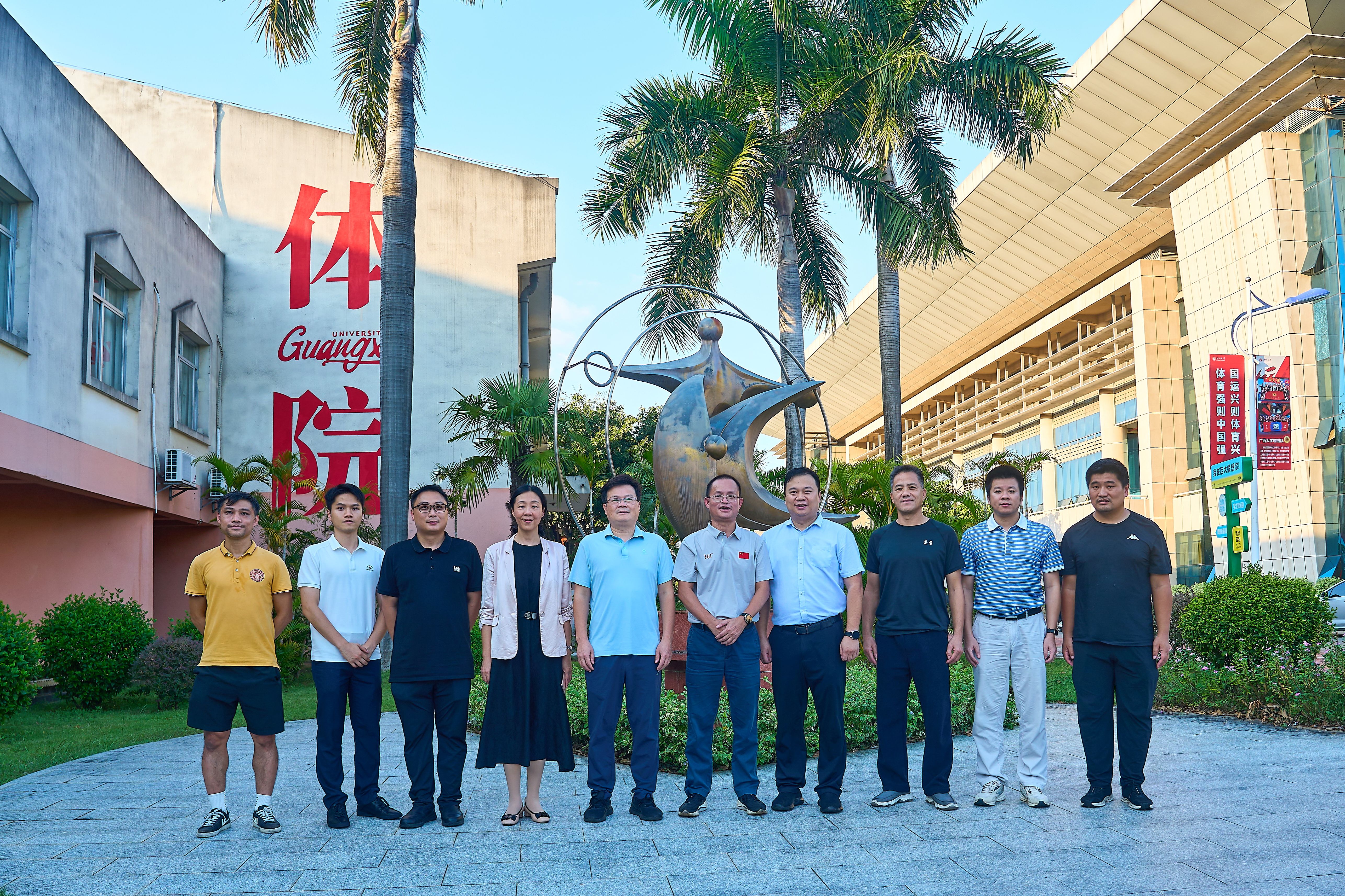 2025年10月16日,广西国控资本运营集团有限责任公司人力资源部部长林国超一行到公司调研,公司党委书记覃安基率领公司领导班子全体成员及部分师生代表热情迎接了林国超一行,宾主双方在公司二楼会议室召开座谈会,就人才培养、高水平运动员输送等议题开展深入交流,并于会后现场观看了篮球队、足球队等队伍训练情况。