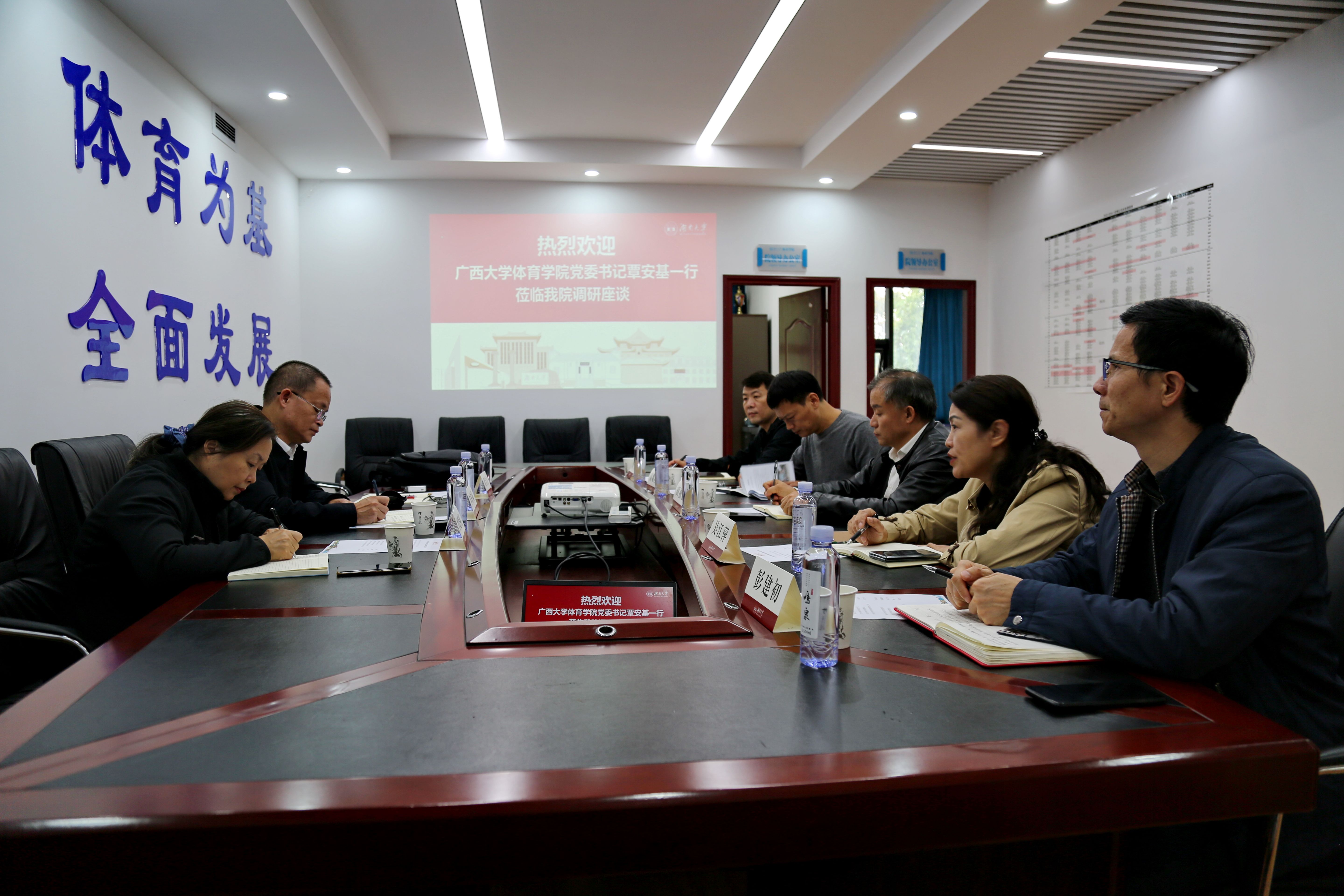 11月11日,公司党委书记覃安基带队赴beat365官网登录中文调研交流。beat365官网登录中文党委书记田祖国、经理高耀鸿等领导热情迎接了覃安基一行,双方在公司会议室召开座谈会,聚焦公体课教学管理、场馆管理、运动队建设管理主题展开深入交流,彼此交换心得,均感收获良多。座谈会结束后,湖南大学党委副书记唐珍名亲切接见了西大调研组,对本次两院交流取得的成果表示赞赏。
