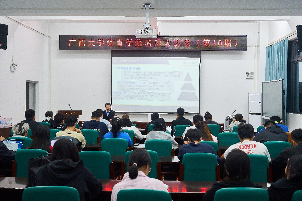 花家涛教授围绕民族传统体育赛事研究的政策与战略背景展开讲述,重点探讨了民族传统体育融入路径、民族传统体育赛事结构、民族传统体育赛事延展等方面内容,并结合龙舟、太极拳等案例的生动剖析,引发在场师生的广泛共鸣。