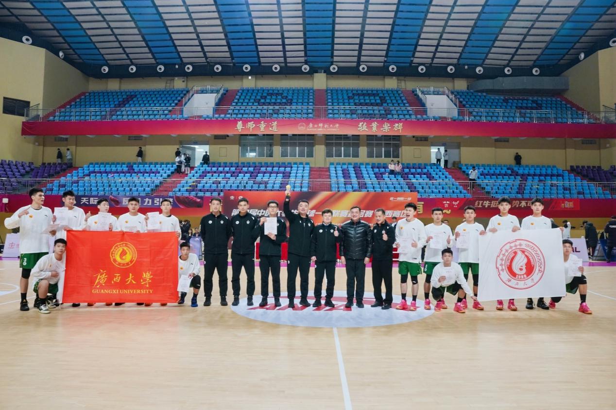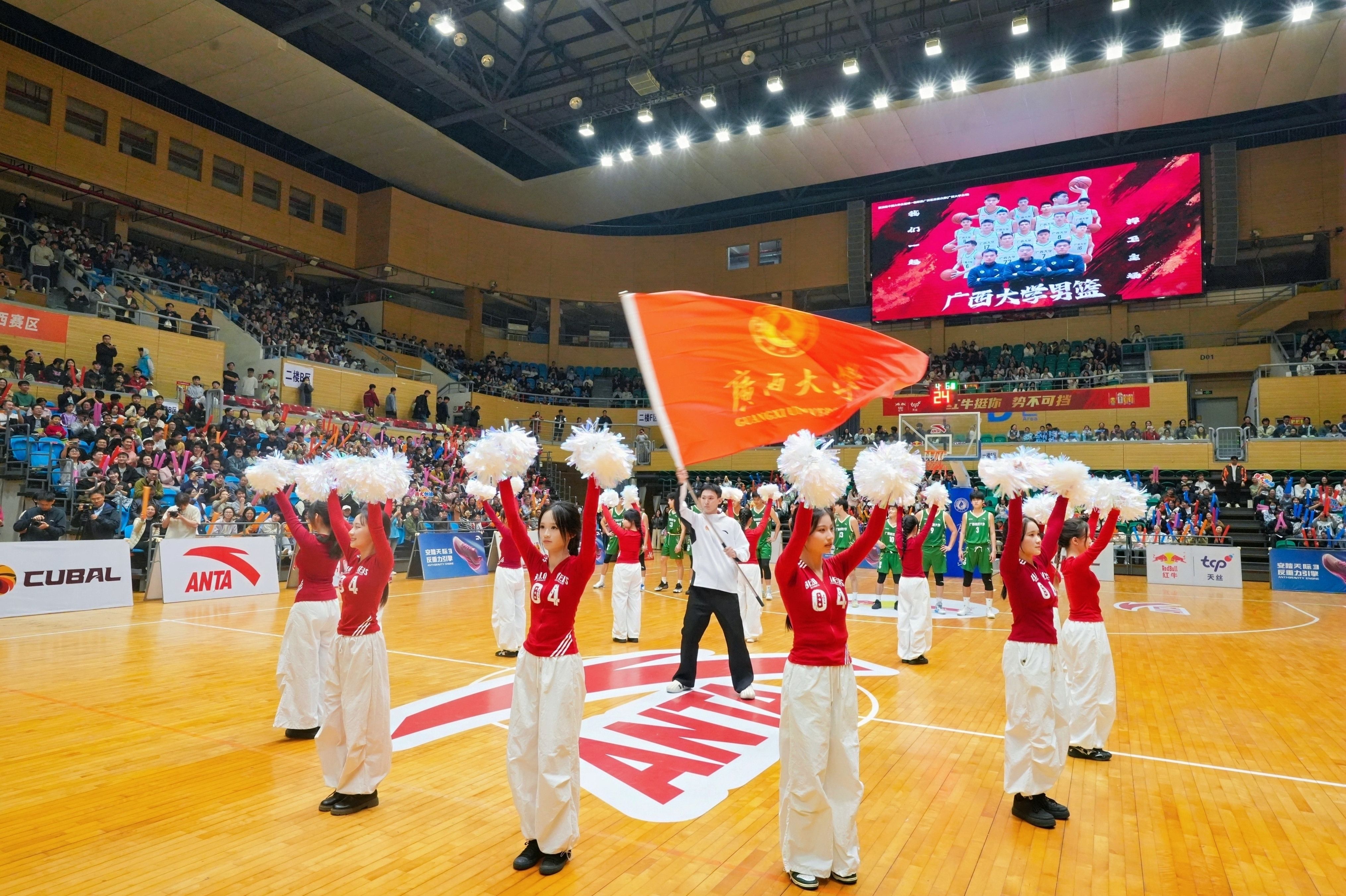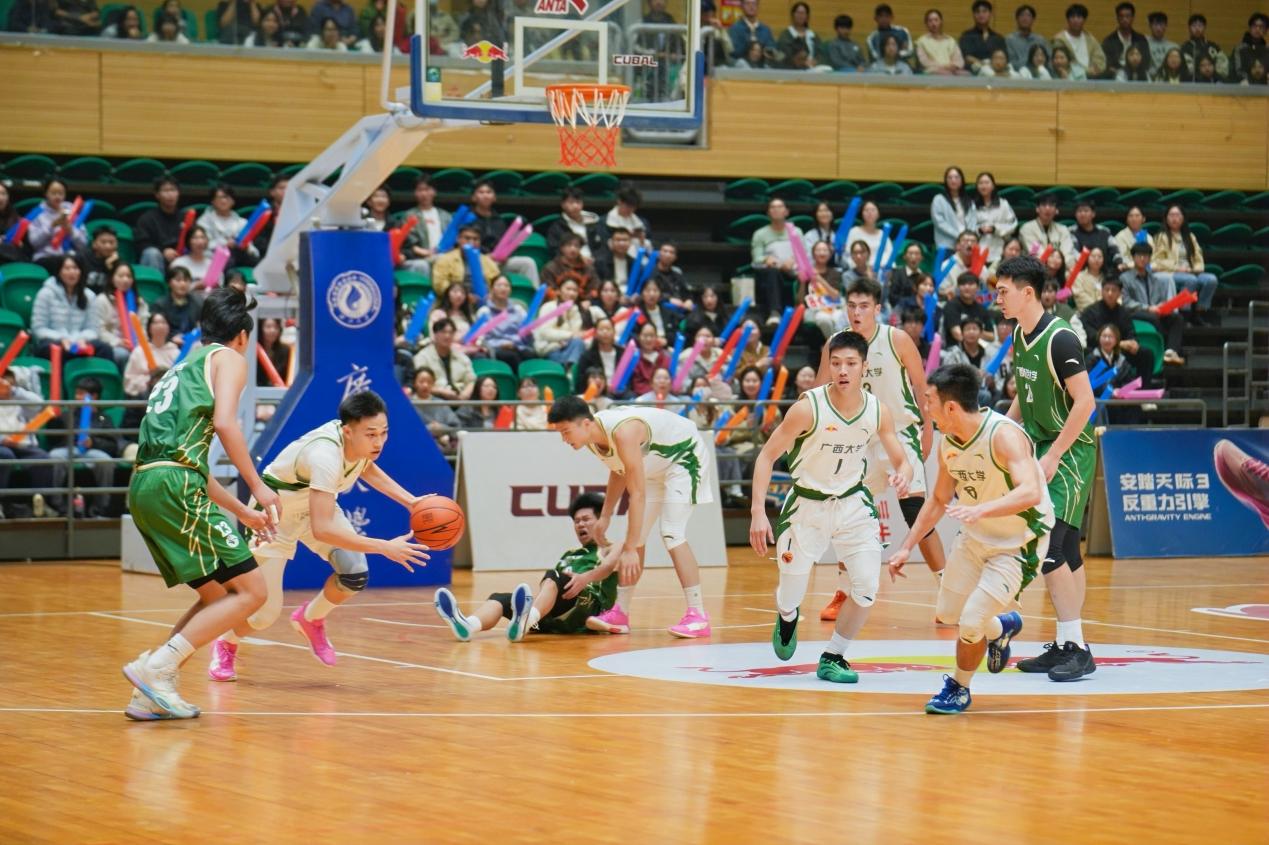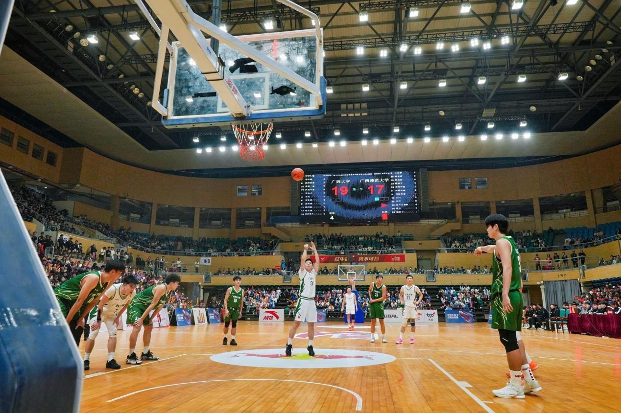 在12月30日决赛首回合比赛中,公司男篮在西校园综合体育馆主场迎战广西师大男篮,凭借全场稳定出色的发挥,最终以93:76击败对手。此场比赛吸引了全校四千余名师生到场观战,现场气氛热烈,助威声、欢呼声此伏彼起,声势浩大。赛前及节间休息时,精彩的啦啦操表演、舞龙舞狮助兴以及互动抽奖环节,一次次点燃全场热情,充分展现了公司学子团结向上的精神风貌。