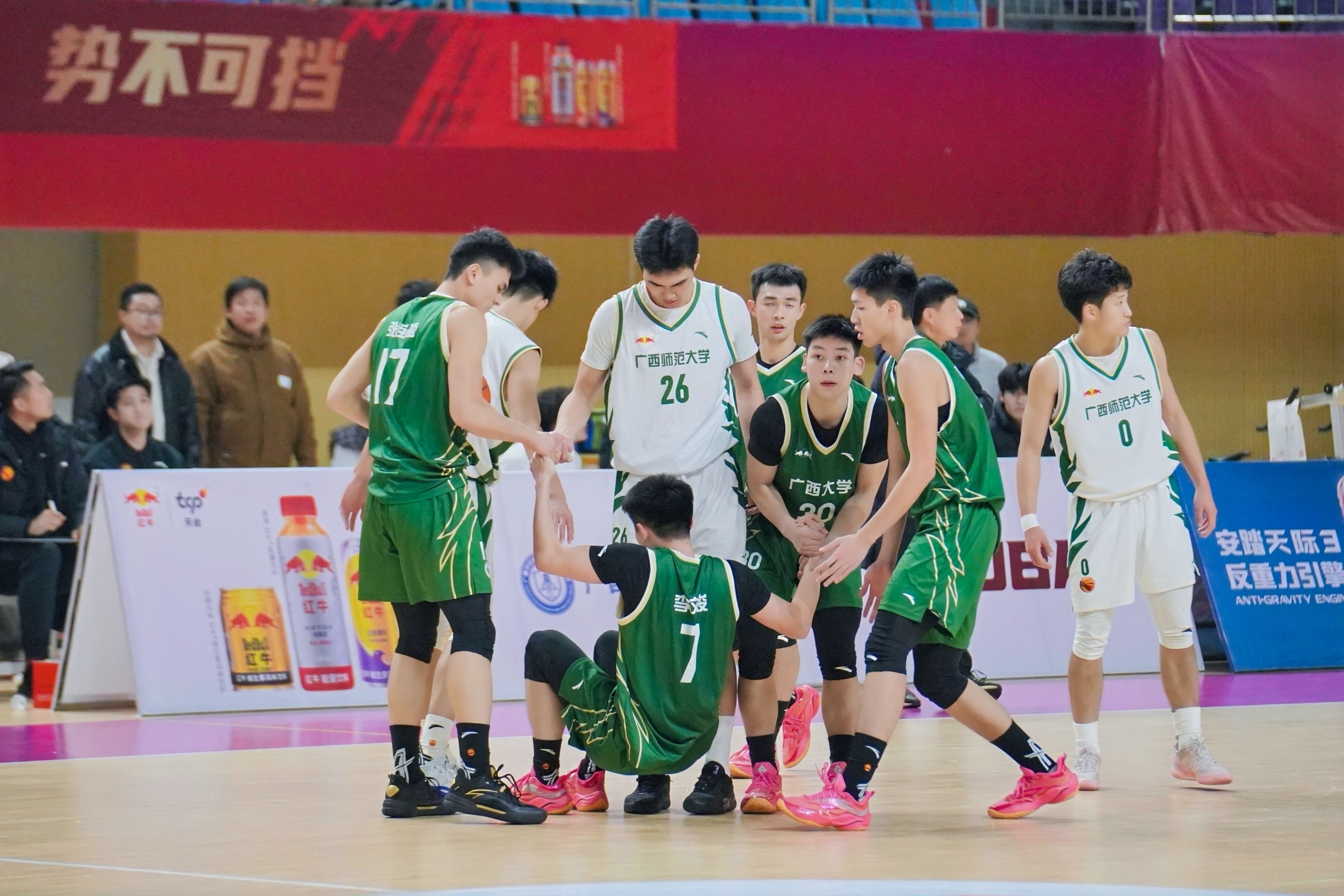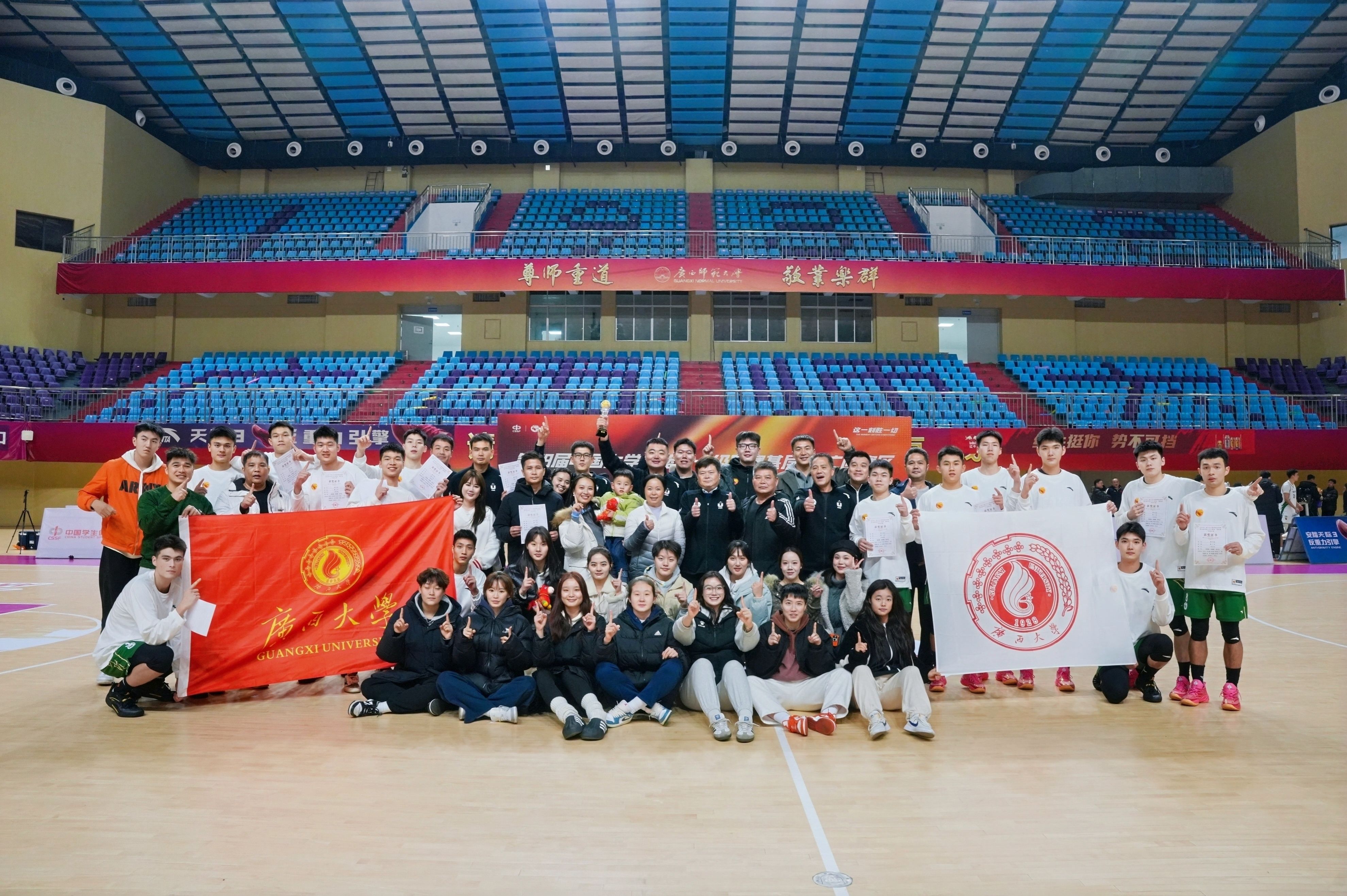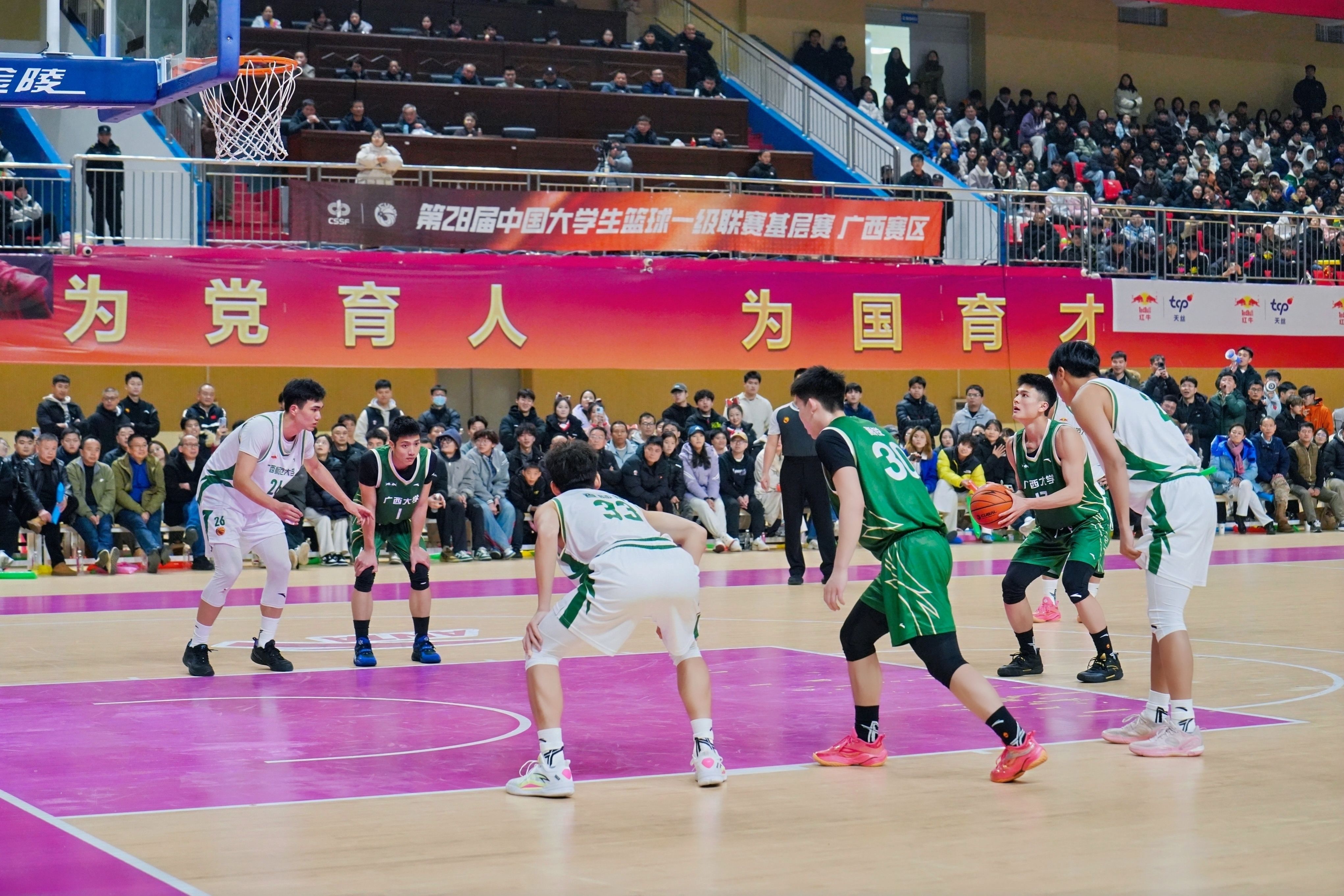 在12月30日决赛首回合比赛中,公司男篮在西校园综合体育馆主场迎战广西师大男篮,凭借全场稳定出色的发挥,最终以93:76击败对手。此场比赛吸引了全校四千余名师生到场观战,现场气氛热烈,助威声、欢呼声此伏彼起,声势浩大。赛前及节间休息时,精彩的啦啦操表演、舞龙舞狮助兴以及互动抽奖环节,一次次点燃全场热情,充分展现了公司学子团结向上的精神风貌。